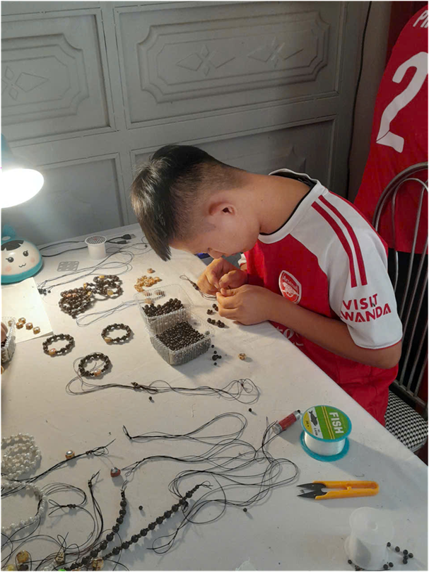 Sau khi hoàn tất khâu chuẩn bị, các em bắt đầu bước vào công đoạn xâu kết – cũng là phần khó nhất. Từng hạt được luồn vào dây cước hoặc dây chỉ một cách cẩn thận, đảm bảo độ chắc chắn và cân đối. Đặc biệt, việc giấu mối nối sao cho không lộ ra ngoài là một thử thách không nhỏ. Điều này đòi hỏi sự kiên nhẫn và đôi tay thật khéo léo, bởi chỉ một sai sót nhỏ cũng có thể ảnh hưởng đến toàn bộ sản phẩm.