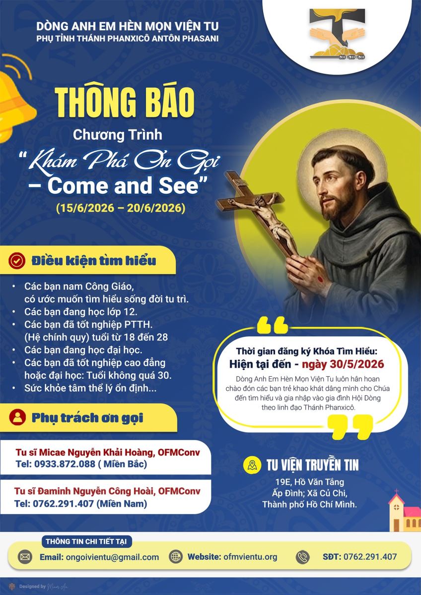 Vì thế, Dòng Anh Em Hèn Mọn Viện Tu (OFMConv) hân hoan chào mừng các bạn trẻ từ mọi miền đất nước hãy đến tìm hiểu đời sống theo tinh thần của vị Thánh nghèo Phanxicô Assisi.